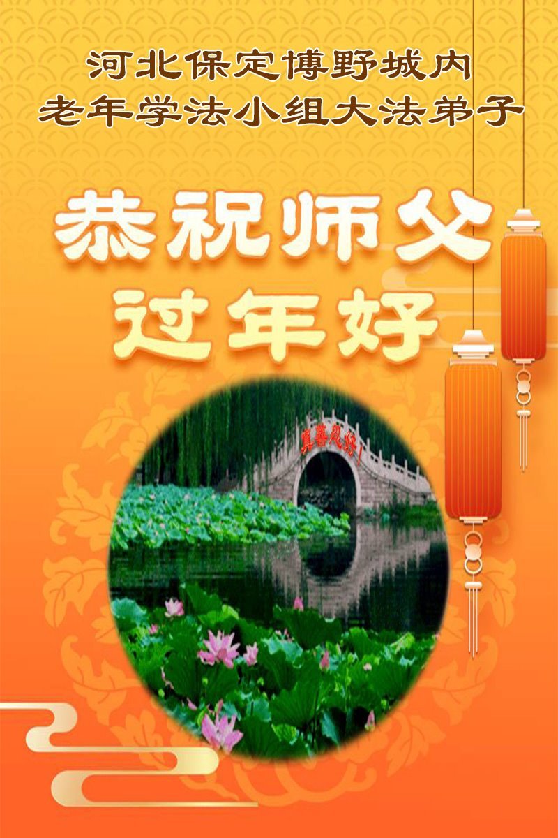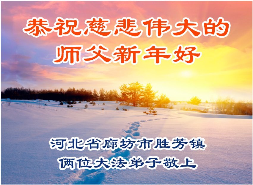 恭祝慈悲伟大的师尊过年好!法轮大法好!真善忍好! 师尊辛苦了!感恩师尊慈悲救度!在有限时间里,弟子要扎扎实实学法、炼功、发正念,多救人,好好度过师尊用巨大承受延续来的每一天时间,努力做好三件事,跟师尊圆满回家。让师尊少操心。 河北省衡水市大法弟子敬上 河北省廊坊市胜芳镇俩位大法弟子恭祝师父新年好!