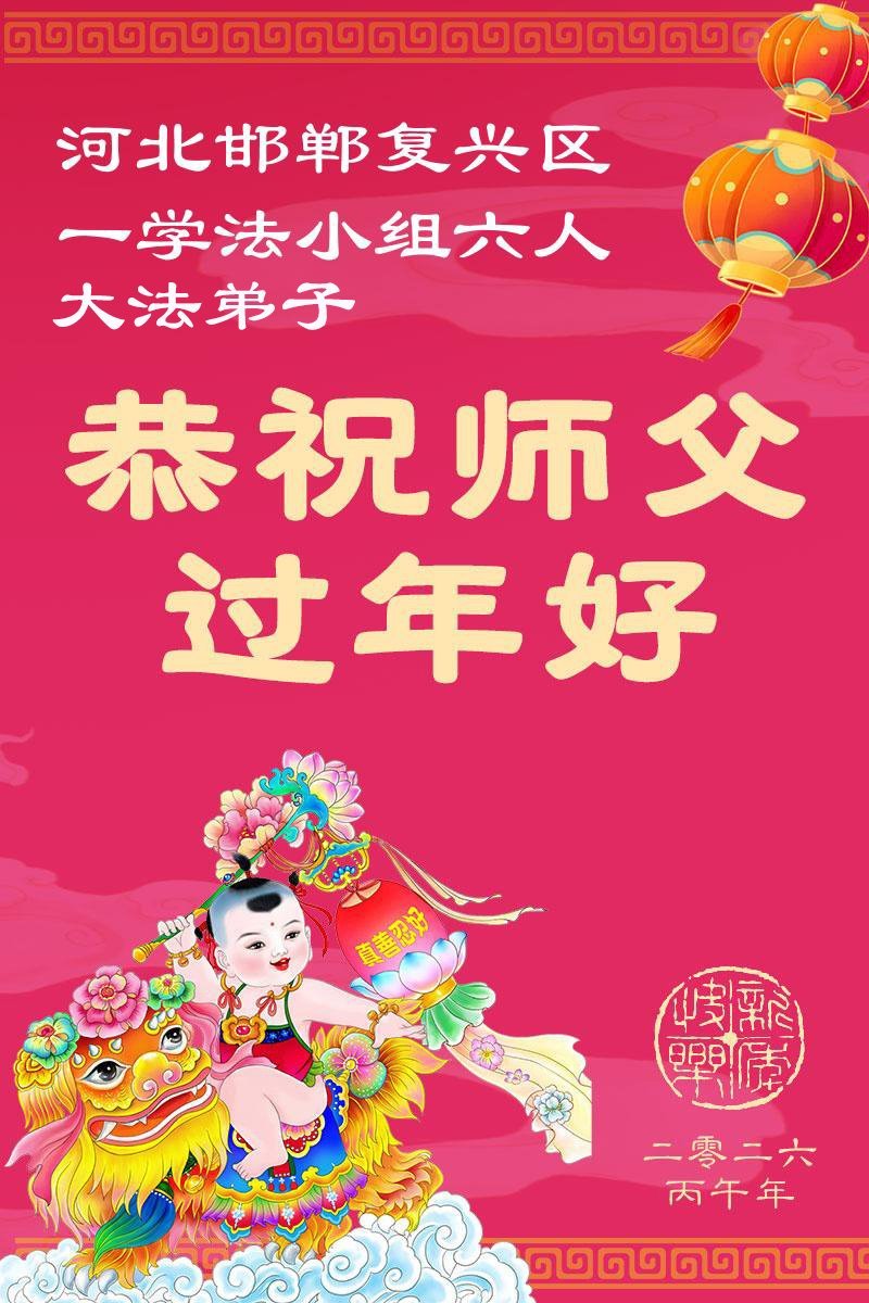弟子们一定听师父的话,多学法,遇事向内找,做好三件事,兑现誓约,跟师父回家。感恩师父的慈悲救度! 河北省张家口市两位大法弟子敬贺 二零二六年一月十三日 河北省邢台市襄都区一学法小组大法弟子敬贺师尊过年好!