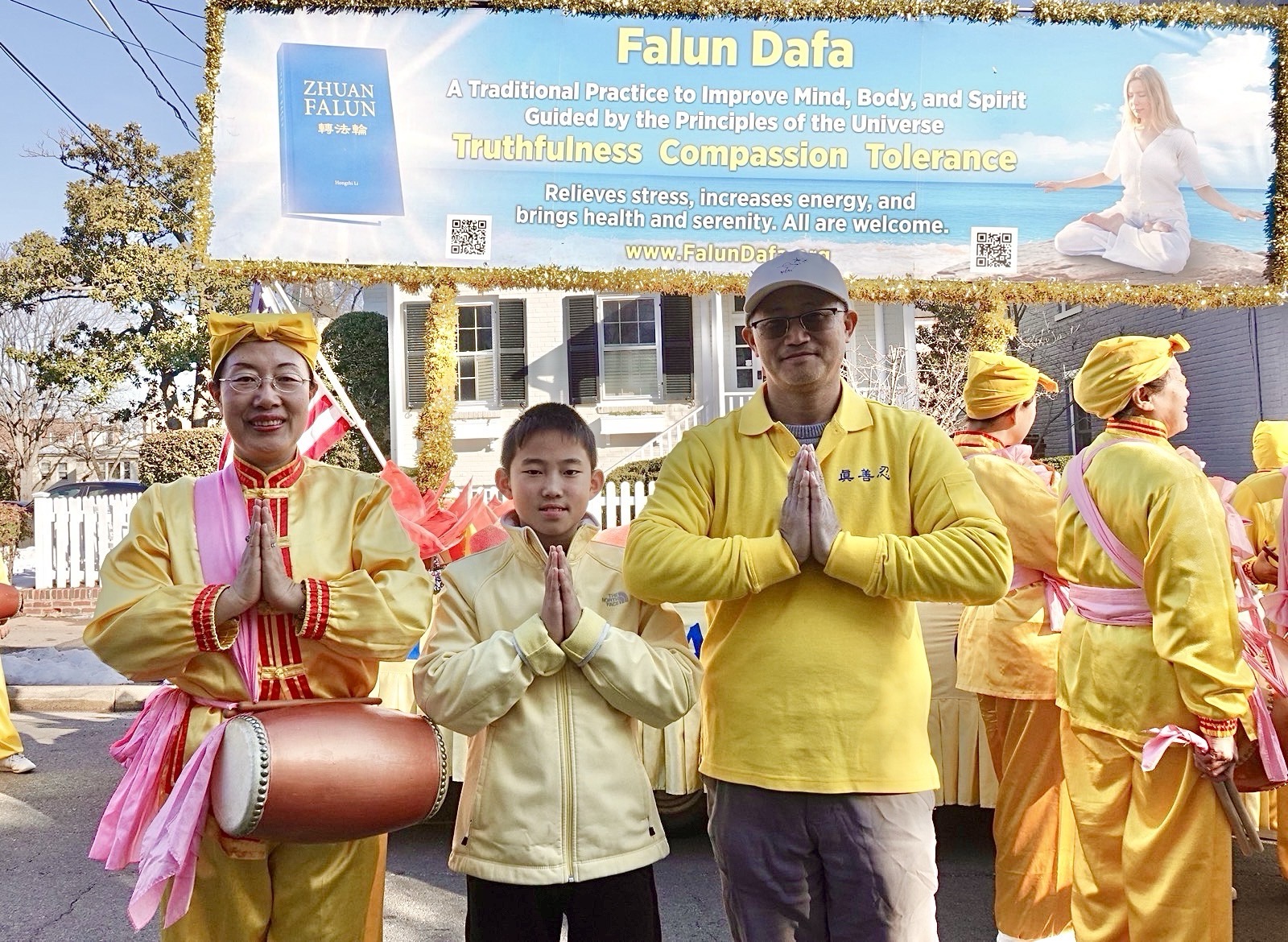 法轮功学员徐少飞和妻子高美霞带着儿子参加了当天的游行。徐少飞是一名系统工程师,他打着法轮大法的横幅走在法轮功游行队伍最前面,高美霞是一名医学博士生,她是腰鼓队的一员,他们的儿子在花车上炼功演示法轮功功法。 徐少飞修炼法轮大法快三十年了。他说:“我认定了真、善、忍就是我的人生准则,不再迷茫困惑,生活变得明明白白!有云:生在人间、值佛出世、得闻佛法,即是三生有幸。衷心感谢师尊!感谢大法!” 高美霞修炼大法二十八年,她说:“修炼大法后,我对许多人生的疑惑烟消云散,真、善、忍从此根植灵魂深处,我的人生有了真正的指南针,知道自己生命的意义,生活不再迷茫,感慨自己无比幸运的同时,深深感恩师父无偿广传大法的慈悲与艰辛!谢谢师尊!谢谢大法!” 当天参加总统日游行的法轮功学员在中国新年来临之际,向李洪志师父表达感恩,祝师父新年好。  图18:参加总统日游行的法轮功学员向李洪志师父表达感恩,祝师父新年好。 |