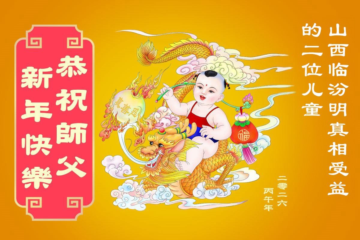 山西省临汾市在大法中受益的两名小朋友恭祝师父新年快乐!
