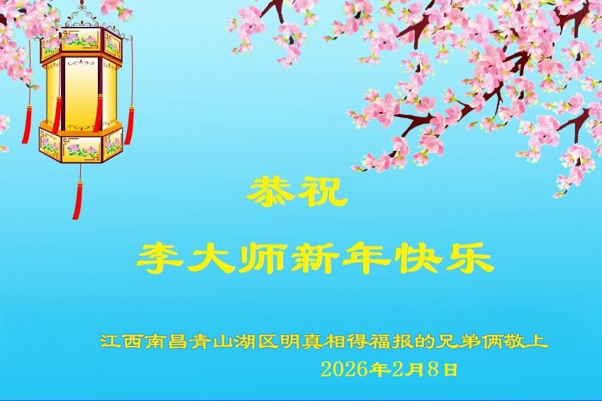 我是一个明真相的高中教师。一直以来我都受到大法的指引、受到大法的恩泽护佑,因此我希望能以自身为范,用言传身教引导学生向善,让中国传统历史文化滋养他们的精神。今后我也要常念“法轮大法好、真善忍好”,提高对自己的要求,走好自己的路。再次感谢大法师父!恭祝大法师父新年快乐! 河南郑州一明真相教师 二零二六年二月十五日 江西省南昌市南昌县教师大法弟子的家人祝李大师新年快乐!