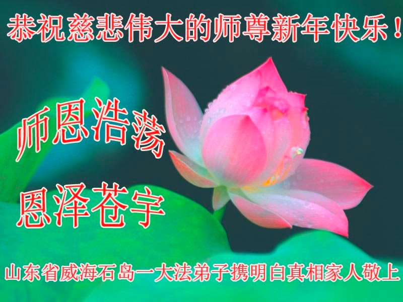 新年到来,弟子及明真相的全家人问候师父,恭祝师父新年快乐! 师父您辛苦了!感恩师父感恩大法。弟子在新的一年里,要真修实修,在法中升华,同化大法,让师父少一份辛苦,多一份欣慰。谢谢慈悲伟大的师父,伟大的法。法轮大法好!真善忍好! 山东省东营市一学法小组大法弟子恭祝师尊新年好!