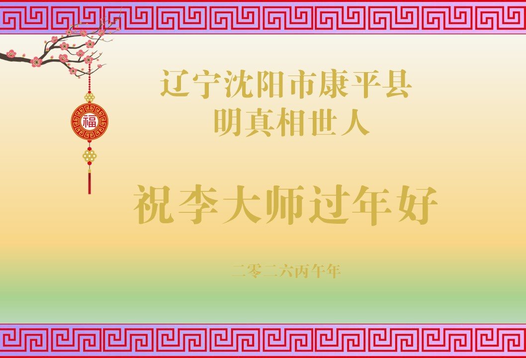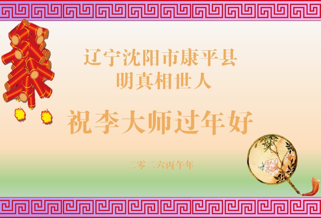 师父救度我们全家,我们都在大法中受益了。今后弟子会听师父的话,记住法轮大法好!真善忍好!我和修炼的奶奶敬谢师恩! 黑龙江省佳木斯一修炼的奶奶和明真相孙子敬上 二零二六年二月七日 黑龙江省普阳农场明真相的世人恭祝李大师新年快乐!