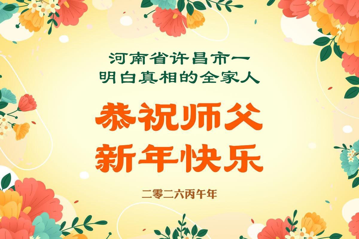 慈悲伟大的师尊好!在丙午年传统新年来临之际,我们全家祖孙三代怀着无比感恩的心情恭祝师尊新年快乐!感恩师尊对弟子的慈悲苦度!我们这个和睦幸福美好的家是伟大师尊的慈悲恩赐!感恩师尊对我们全家的无量恩泽,师尊您辛苦了!明白真相的家人们也在告诉世人真相。弟子永远牢记师尊教导,努力修好自己多救人。早日恭迎师尊回神州!重庆南滨一大法弟子及全家拜谢师尊,恭祝师尊新年快乐! 重庆南滨一大法弟子及全家 二零二六年二月十四日 河南许昌一明白真相的全家人恭祝师父新年好!