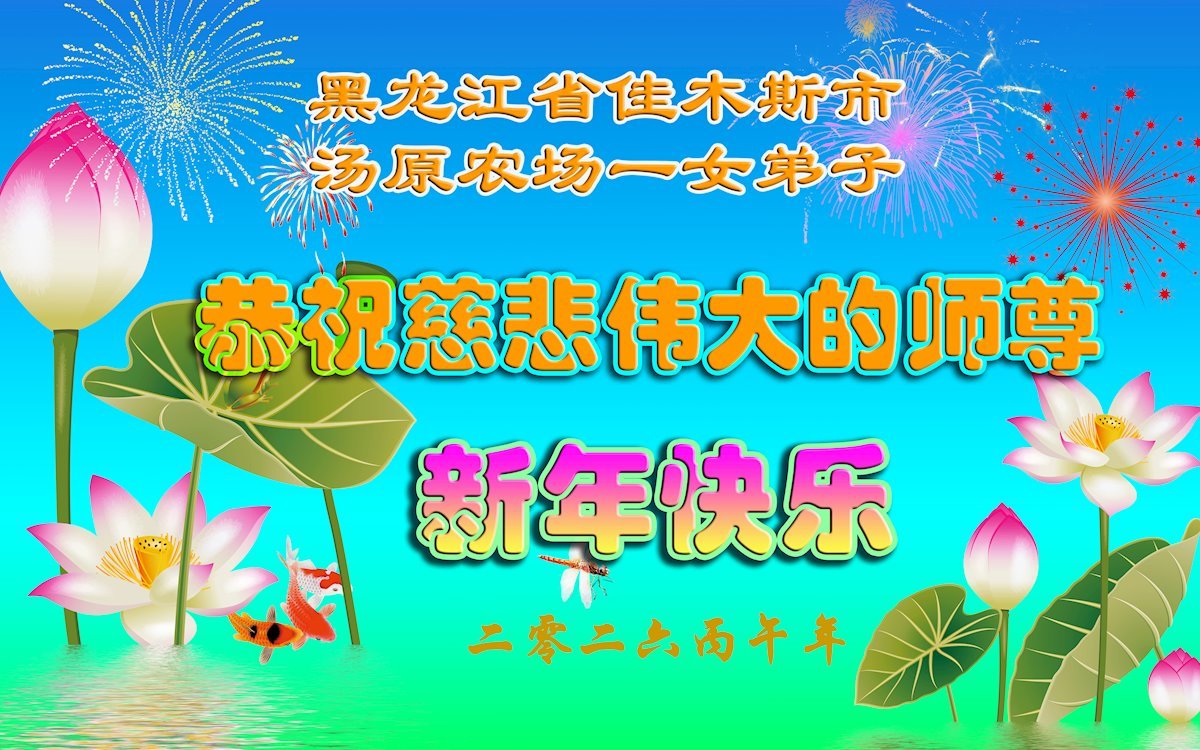 恭祝慈悲伟大的师尊新年快乐!谢谢师父时时保护,弟子只听师父的话,学好法、精進做好三件事,功成圆满随师父回家。弟子叩谢师尊。 黑龙江省大法弟子敬上 黑龙江省佳木斯市汤原农场一女大法弟子恭祝师尊新年快乐!