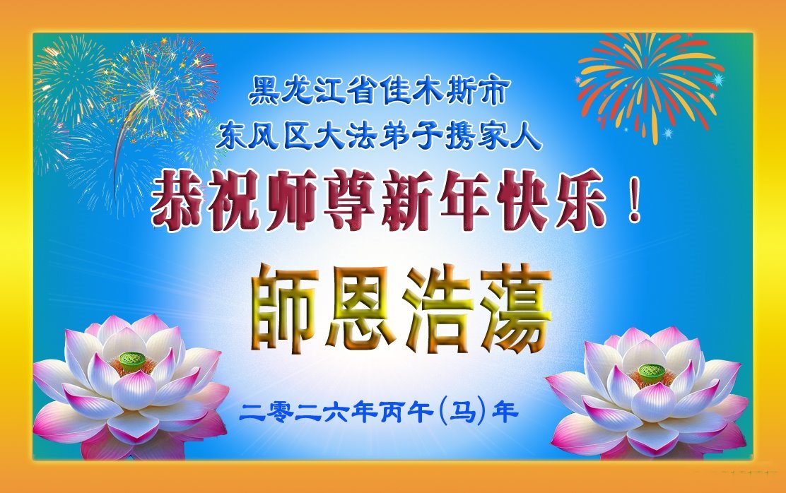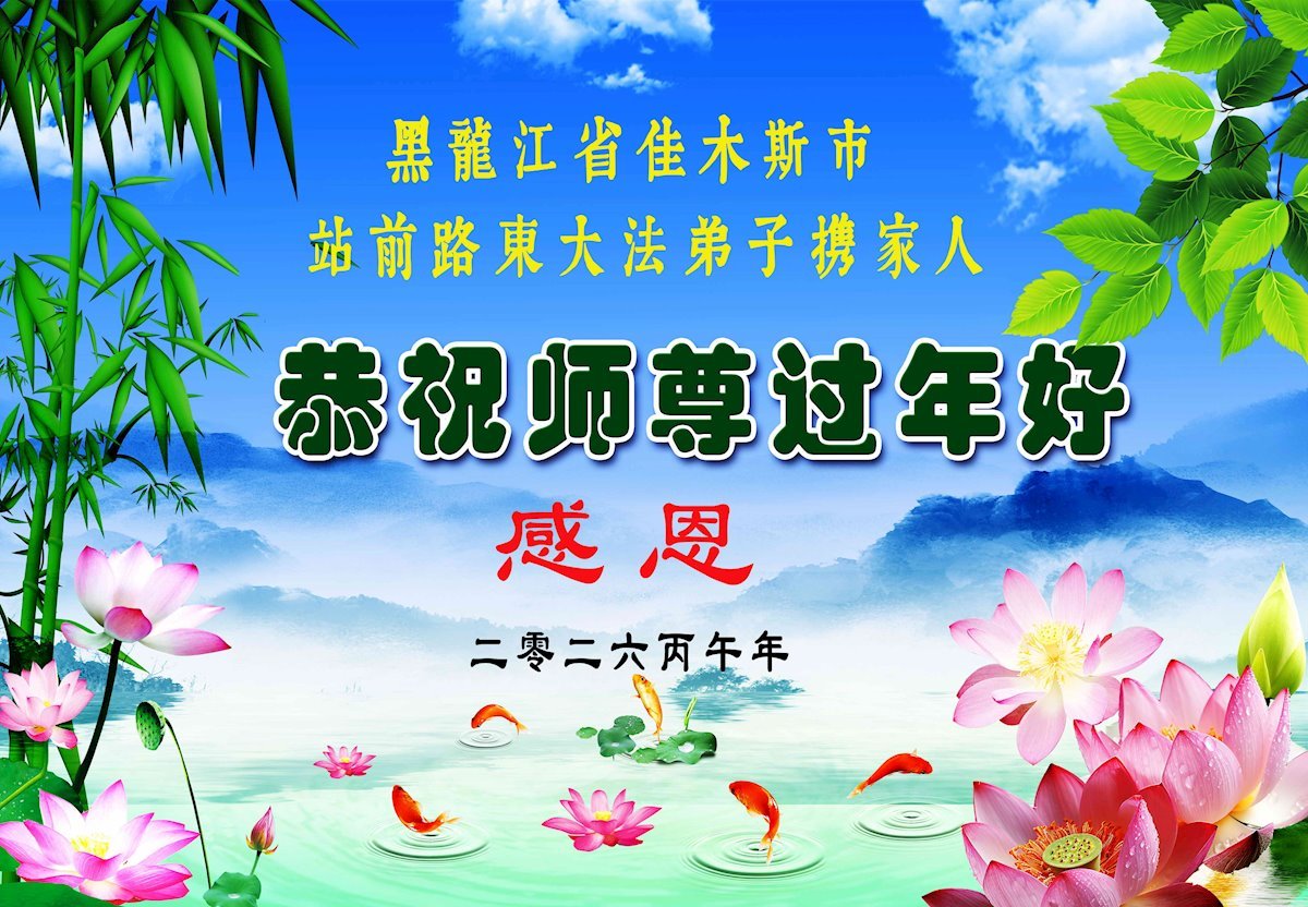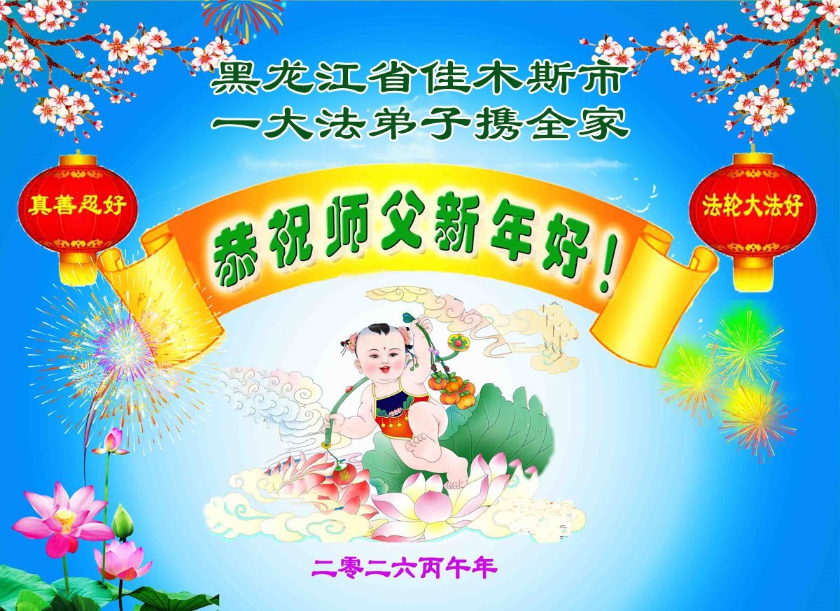 恭祝慈悲伟大的师尊过年好! 天天背法正念添,锁定邪恶发正念。 遇到问题找自己,走街串巷救有缘。 众生得救是我愿,再苦再累心里甜。 盼望师尊回大陆,师徒相聚大团圆。 恭祝师尊新年好,兑现誓约随师还。 黑龙江省佳木斯市一女大法弟子携家人敬上 黑龙江省佳木斯市站前路东大法弟子携家人恭祝师尊过年好!
