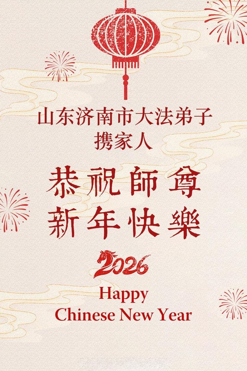 师尊正法日新月异, 神韵威力贯通新宇。 大法弟子正念不移, 邪恶末路烟灭飞灰。 弟子一定做好三件事,向师尊交一份满意的答卷! 山东济南市历城区家庭学法小组 二零二六年二月十二日 山东省潍坊市一大法弟子恭祝师尊新年好!