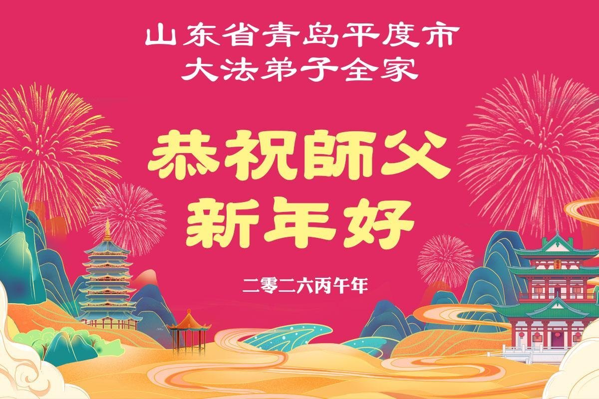 师尊您辛苦了!在新年到来之际,我们平度学法小组五位大法弟子怀着无比感恩的心,祝您新年快乐!在这最后不多的时间里,我们会抓紧时间,共同精進,修好自己,互相救助,多救人。 平度大法弟子敬上 二零二六年二月十四日 山东省青岛市平度市一家大法弟子恭祝师尊新年快乐!