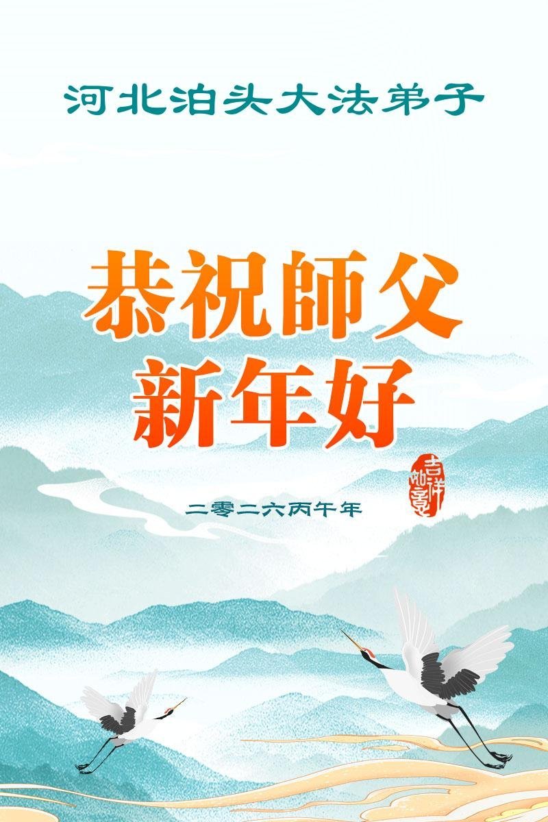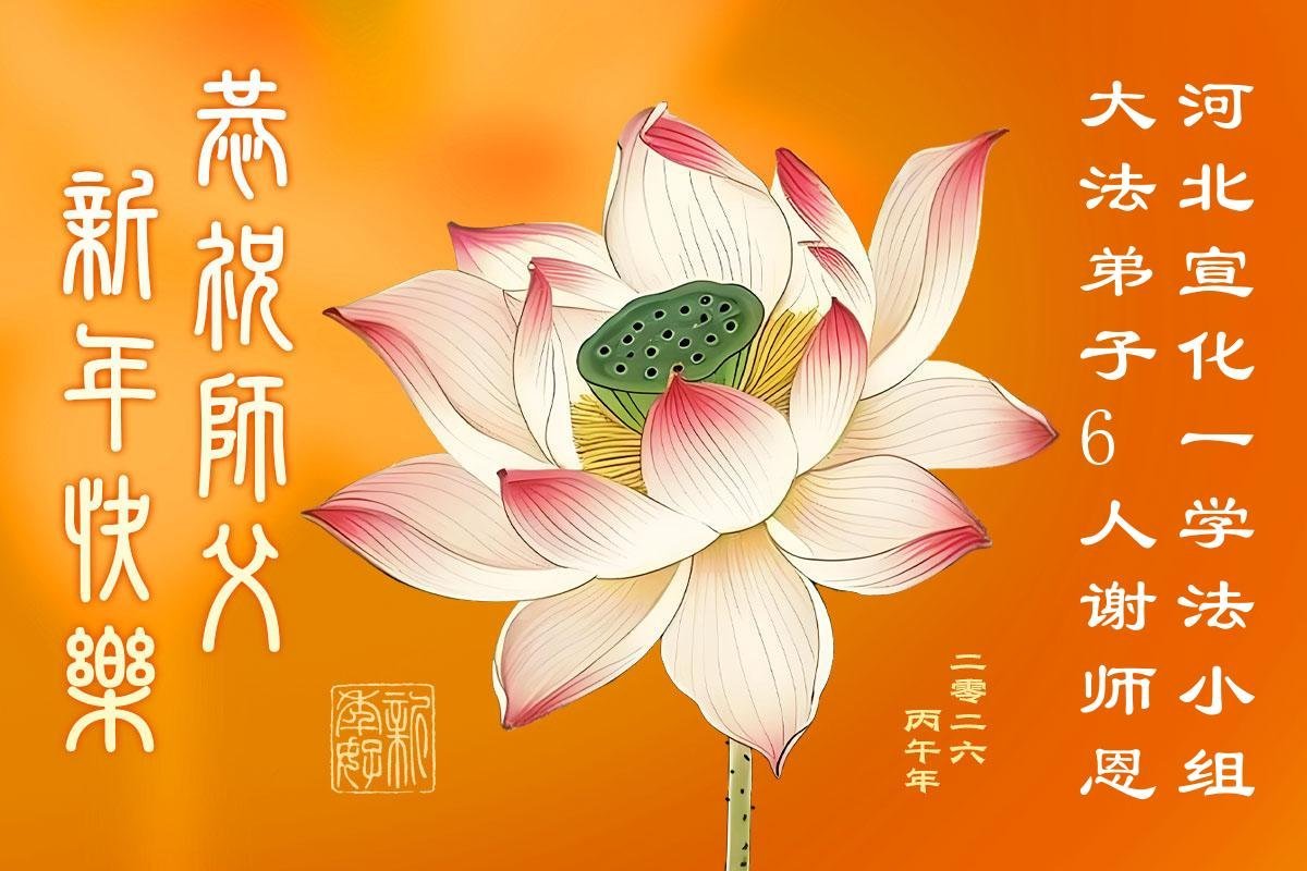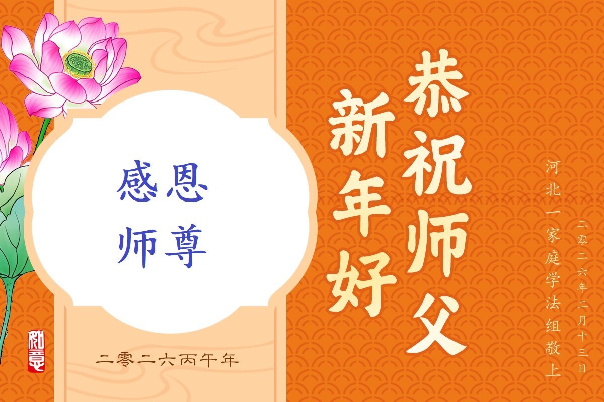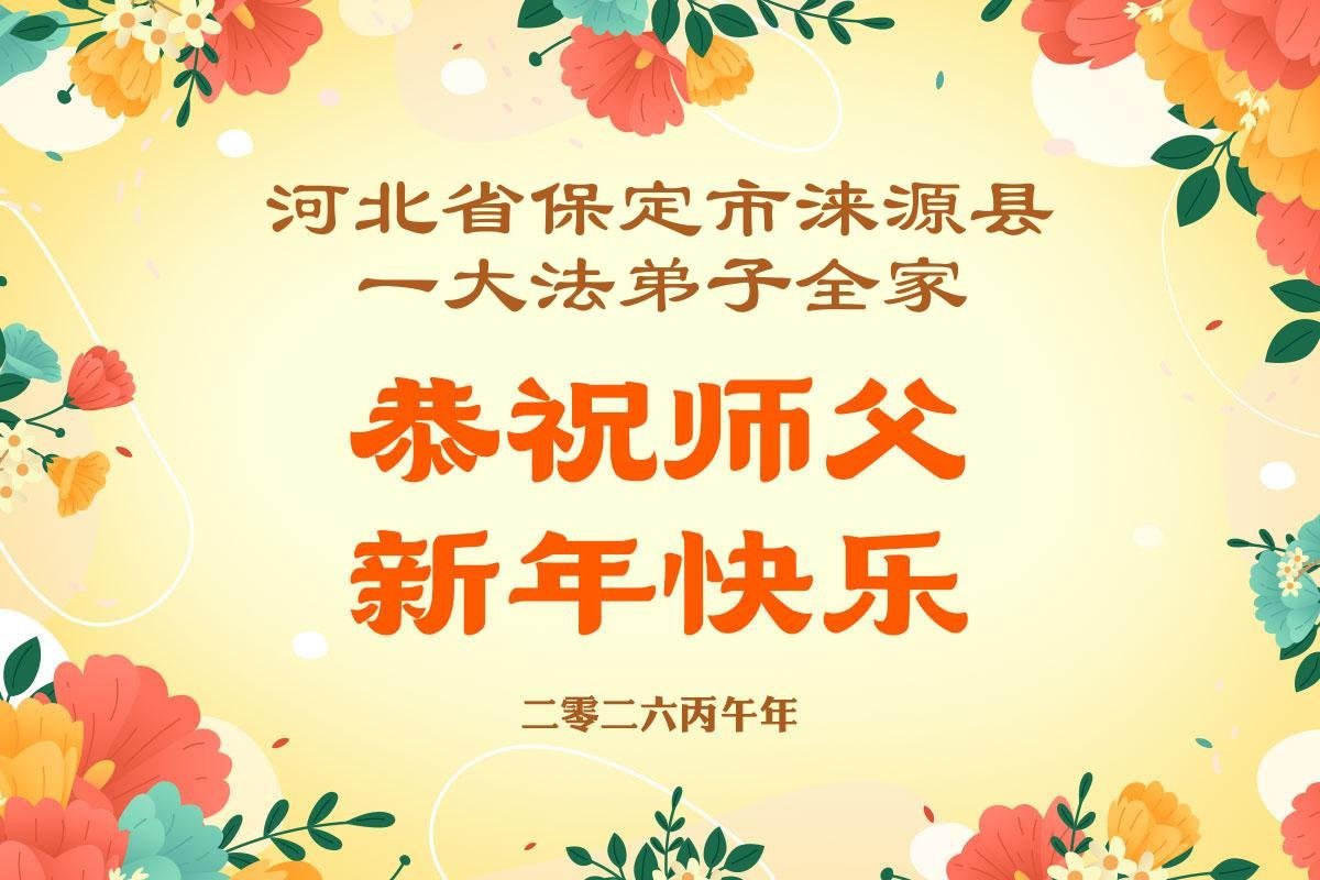 我们学法小组多年来一直沐浴在大法佛光普照中,对师尊救度洪恩的感激无以言表,值此二零二六丙午年到来之际,恭祝伟大慈悲的师父过年好!法轮大法好!真、善、忍好! 我们深知,不但我们的生命是师父给予的,而且经过漫长的岁月后师父又再一次次把我们从无知、愚昧、变异和堕落中、从地狱中捞起来,为我们承受了难以想象的一切;我们的正念、能力、智慧、美德等纯正的一切都来自于大法;所拥有的一切幸福、美好、慈悲、快乐等都源于师父的圣恩;一切荣耀都归于伟大慈悲的师父! 再次无限感恩师父的同时,我们愿都成为助师正法的合格弟子、做创世主永远善良和幸运的孩子! 没有师父的慈悲保护我们走不到今天!跪拜师尊过年好! 河北廊坊燕郊一学法小组全体大法学员弟子敬上 乙巳年腊月廿六 河北省张家口宣化区一大法弟子恭祝师尊新年快乐!