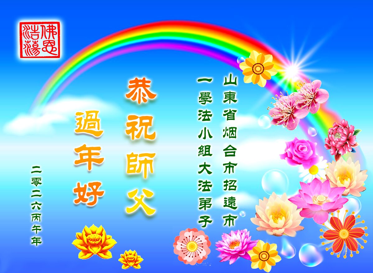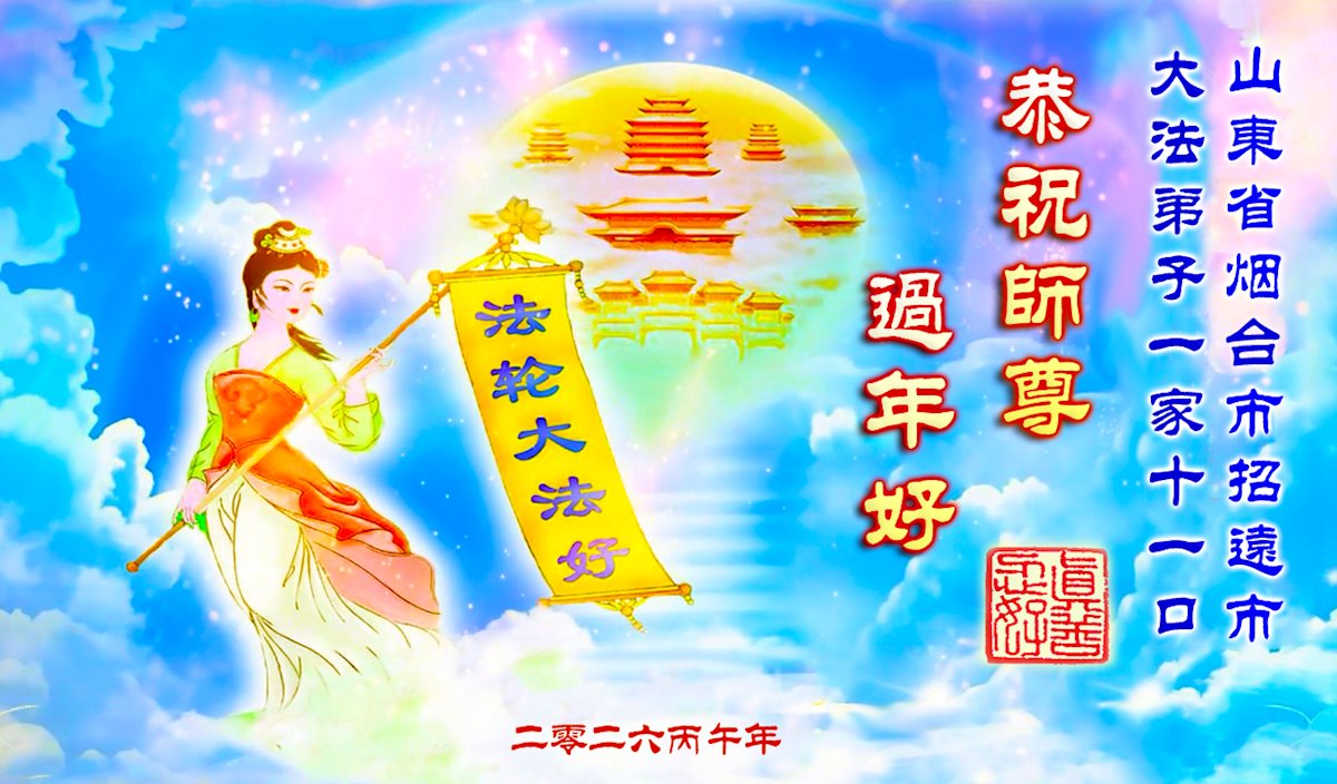 恭祝师父过年好!师父辛苦了! 携众拜师 法鼓声声催, 天众待王归, 福音遍遍洒, 法轮满天飞, 法徒真言劝, 盼众随主回, 佳节今又至, 携众拜师尊, 圣王恩厚重, 万言难表心。 山东省烟台市招远市一学法小组全体大法弟子敬上 2026年2月9日 山东省烟台市招远市大法弟子恭祝师尊新年快乐!