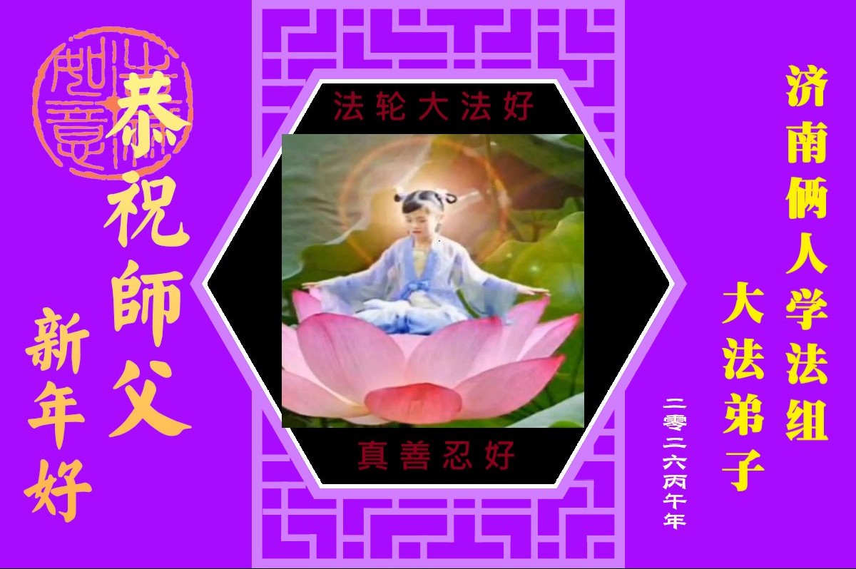 恭祝师尊新年快乐! 山东省济南市两位大法弟子携子女敬上 山东省济南市一学法小组大法弟子恭祝慈悲伟大的师父新年快乐!