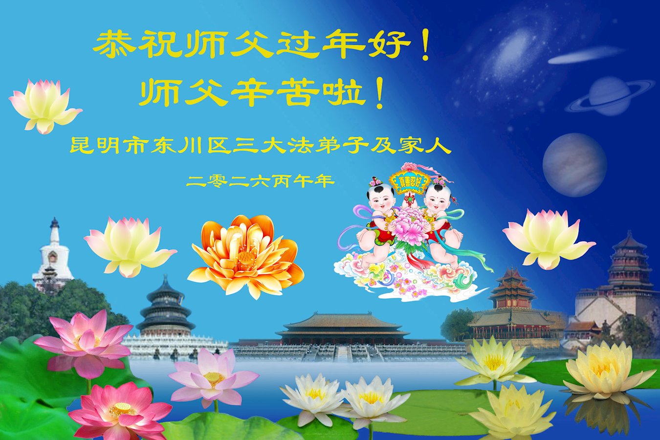 恭祝慈悲伟大的师尊过年好! 师父辛苦了!弟子叩拜师尊! 云南省昆明市大法弟子恭祝慈悲伟大的师尊过年好!